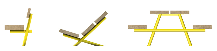 The wood profiles and tubular powder coated steel tubes are both an integral part of the structure and form objects with a strong visual contrast between natural and man made materials. The simple & sculptural shapes should integrate well in natural environments, yet stand out enough to be noticed for its quality.