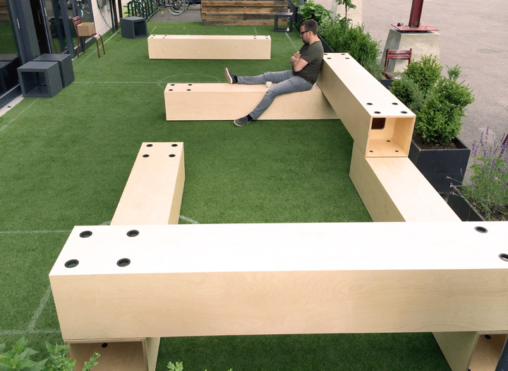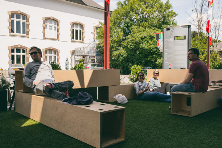Conventional tables and chairs wouldn’t have worked that well for the terrasse of my local hangout. The cultural centre Carrérotondes in Luxembourg, with its concerts, exhibitions, kids theatres and parties required a flexible way of sitting (and drinking). The Lego principle gives plenty of options on how to configure the modules, leaving it up to the user and the moment to choose how to use them.
