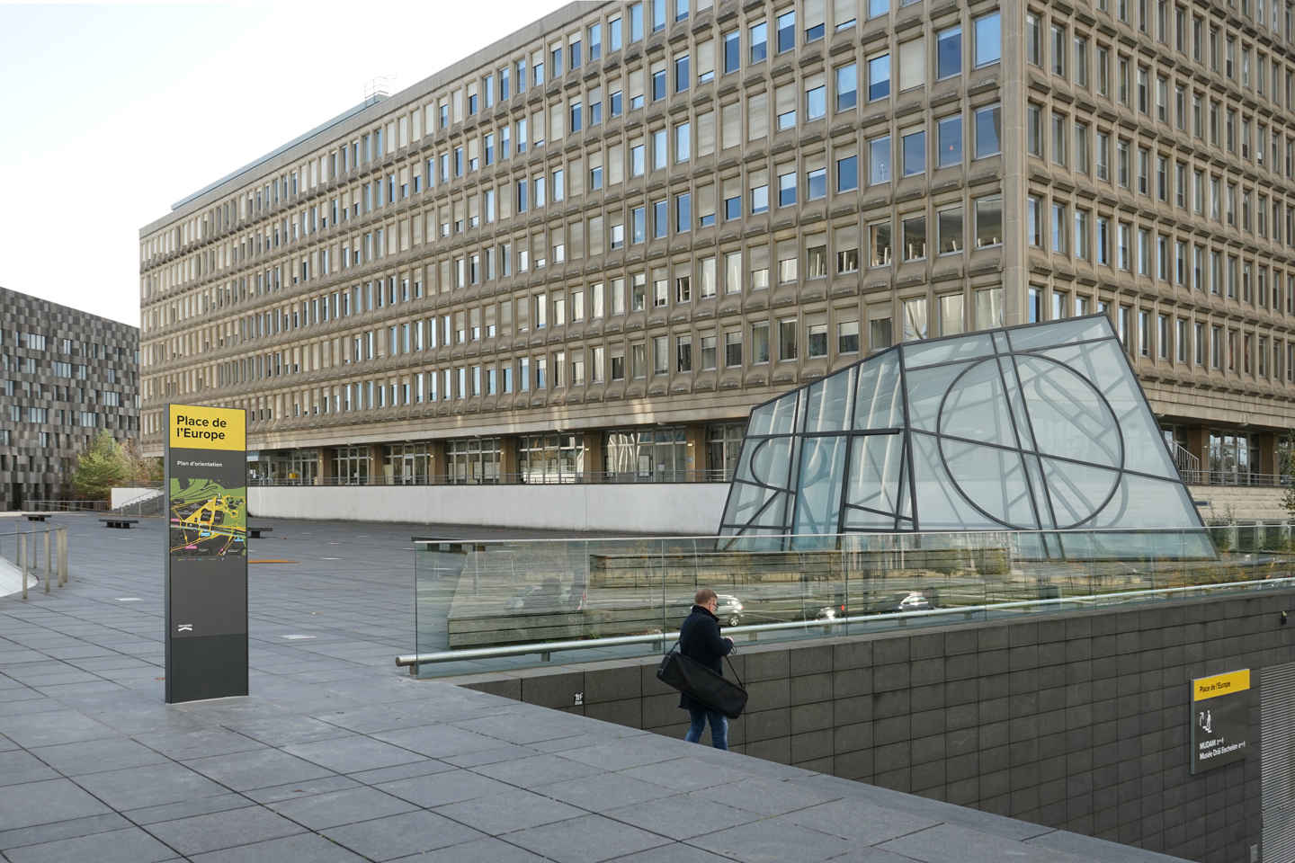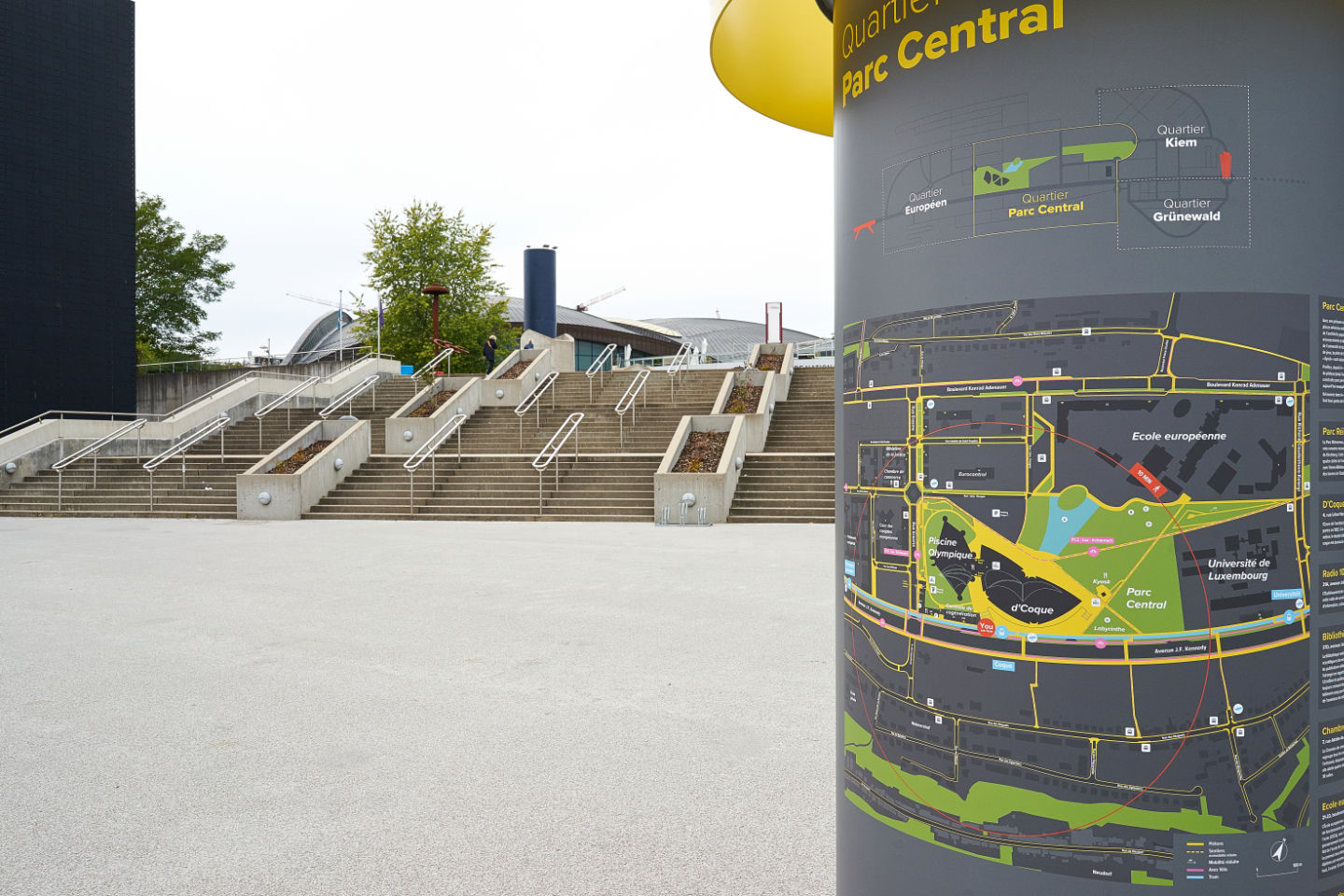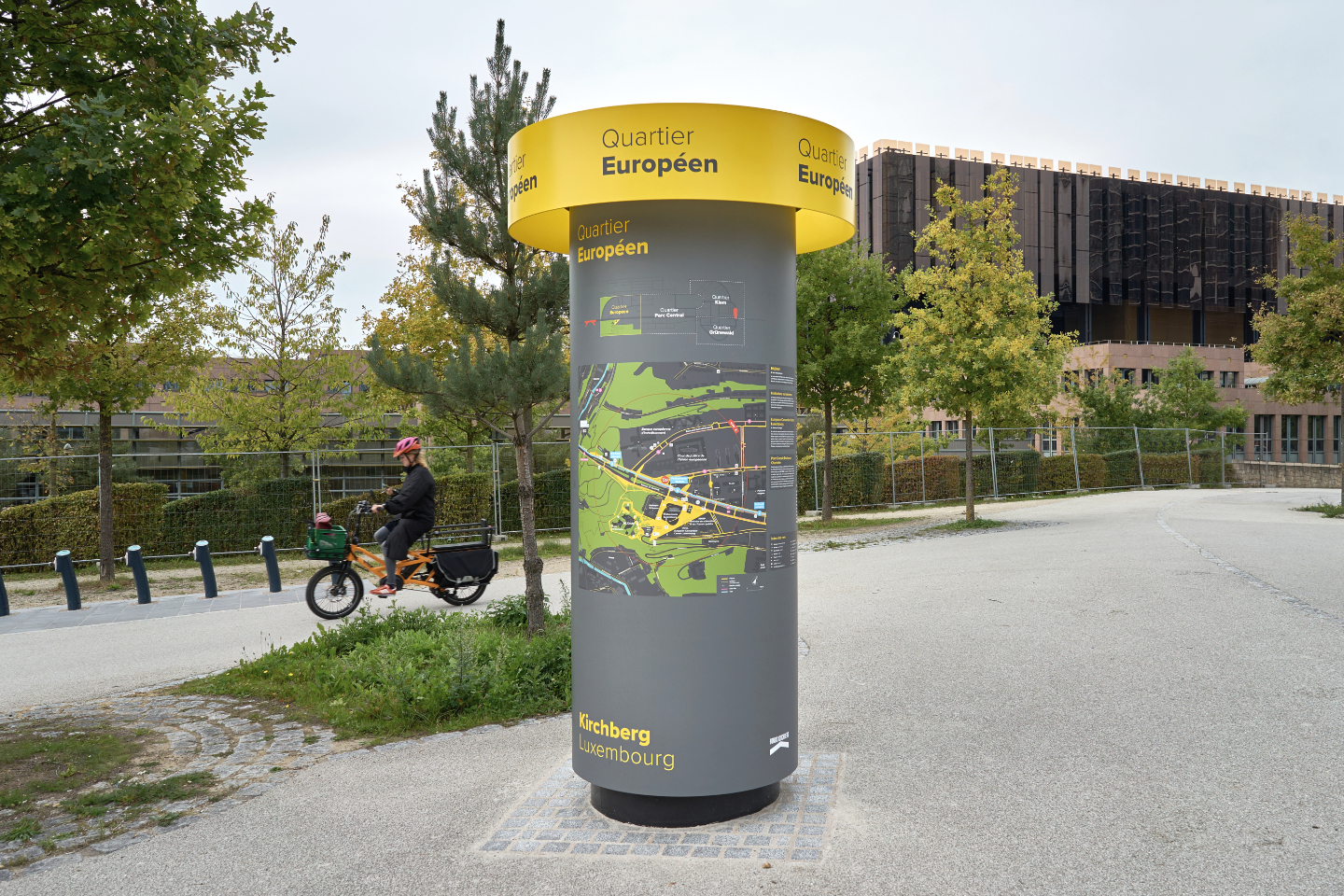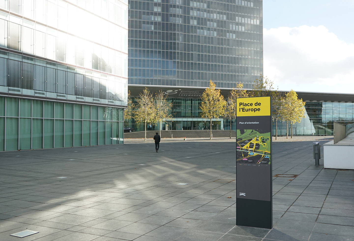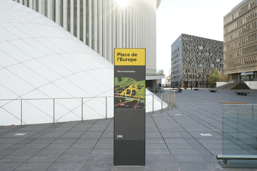 After developing a comprehensive wayfinding concept for the Kirchberg area in Luxembourg-city, and a prototype at the Central Parc, we have now rolled-out the first module of our system at the Place de l’Europe. The overall concept consists of a family of modules adapted to different urban scales and their context. The implementation of the signage system across the area is planned over the coming 12 months.