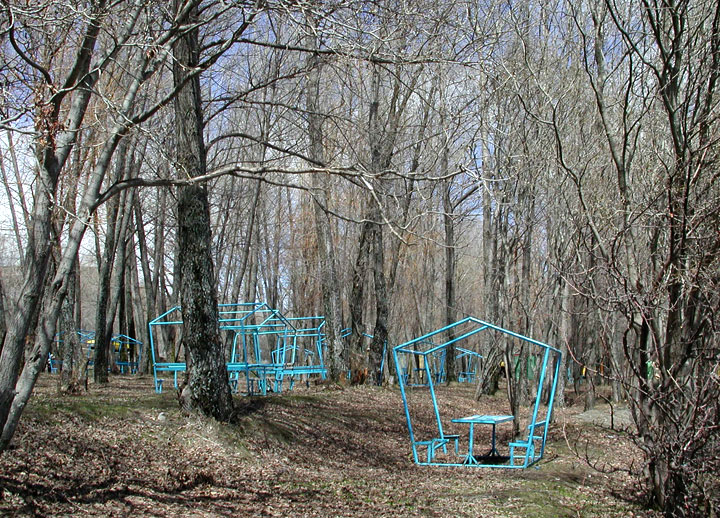 A friend of mine sent me this amazing picture of a picnic area in the woods near lake Sevan in Armenia. The first reflex of a local authority would be to paint these structures in a camouflage green / grey to blend in. I find this choice of colour stunning and beautiful, the contrast of the cyan blue in the wood highlights both nature and man-made structures, producing a surreal fairytale ambiance.